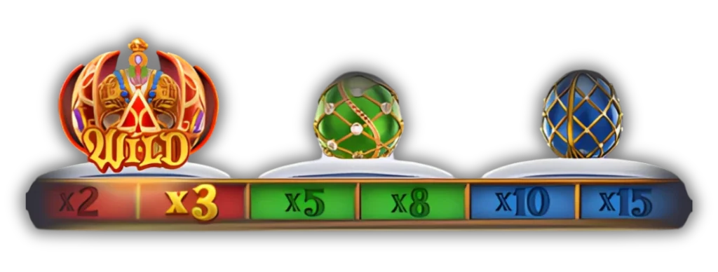 - เข้าสู่รอบที่ 3 เงินรางวัลที่ได้ก็ยิ่งบ้าพลัง คูณ 8 เข้าไป ไข่สมบัติสีเขียวที่อยู่ในรอบนี้ก็เปลี่ยนตัวเองเป็น Wild ทั้งหมดเหมือนกัน