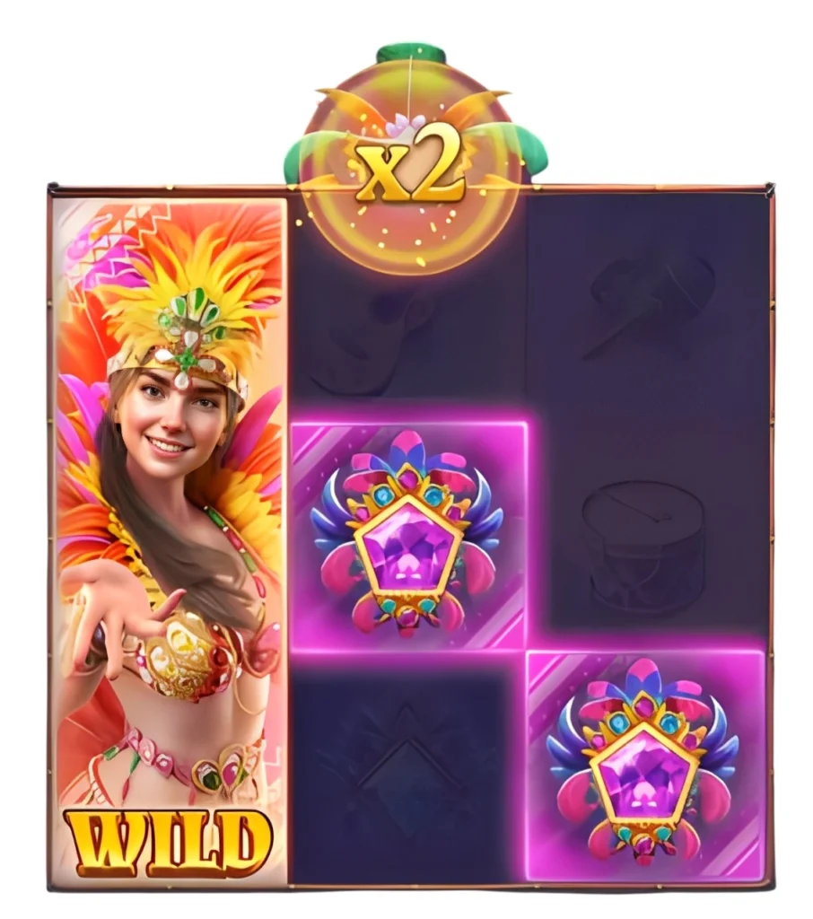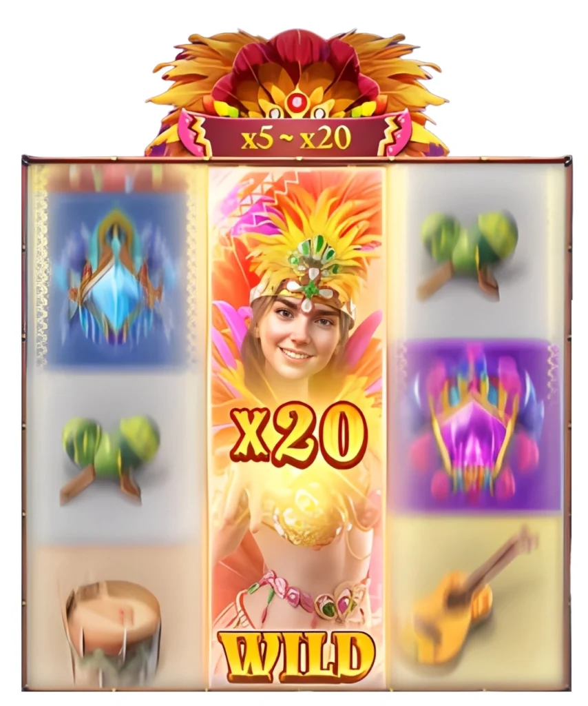 • สัญลักษณ์นักเต้นคาร์นิวัล ตัวนี้แหละตัวท็อปสุดของเกม ถ้าปรากฏครบ 5 ตัวบนไลน์นะ เตรียมเฮเลย เพราะเงินจะเด้งเข้า x50 เท่าของเงินเดิมพันแบบไม่ต้องลุ้นให้เหนื่อย